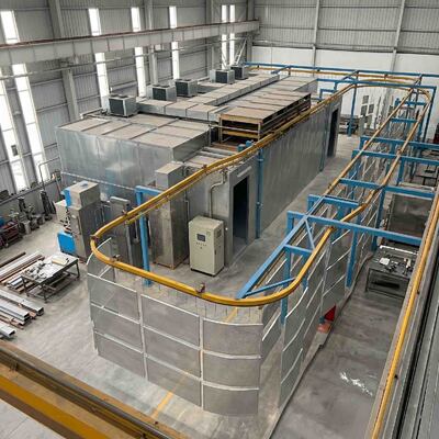 سیستم جابجایی مواد صنعتی سقفی که قطعات فلزی را از طریق یک کارخانه تمیز پوشش پودری و تولیدی هدایت می کند.